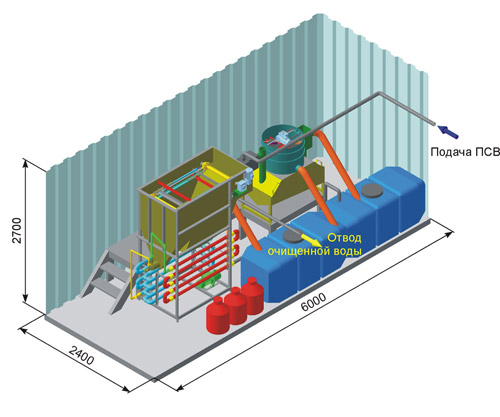 При сбросе очищенных стоков в канализацию ЛОС размещаются в 20-футовом контейнере, при отведении стоков в водоем — в 40-футовом. Контейнеры оснащаются системами приточно-вытяжной вентиляции, отопления и освещения. Общий вид стандартного контейнера с ЛОС: